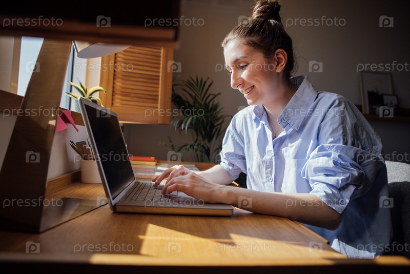 Красивая девушка в повседневной одежде печатает на ноутбуке. Улыбающаяся молодая женщина работает за компьютером в гостиной. Студентка учится дома