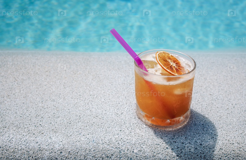 Близкий план вкусного цитрусового коктейля в стакане на берегу бассейна. чашка газированного напитка со сломкой и куском апельсина на фоне голубой воды