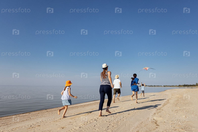 Счастливая молодая семья на летних каникулах.Дети и их родители летают на змее у реки