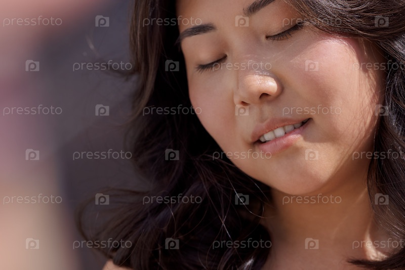 Азиатская женщина с длинными темными волосами, закрытыми глазами, наслаждающаяся моментом спокойствия при естественном свете, демонстрируя безмятежное выражение лица и спокойную атмосферу на фоне мягкого фокуса