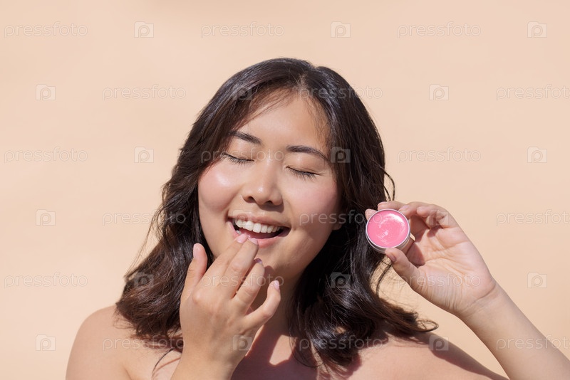Азиатская женщина, наносит бальзам для губ с радостным выражением лица, держит маленький контейнер розового продукта на мягком бежевом фоне, демонстрируя красоту и самообслуживание