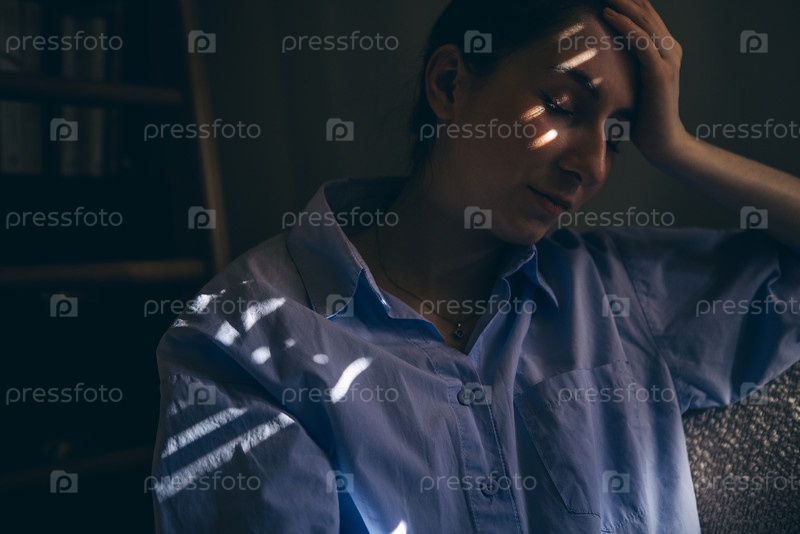 Портрет молодой усталой женщины в голубой рубашке, сидящей на стуле.Девушка с головной болью закрывает глаза и держит голову за руку