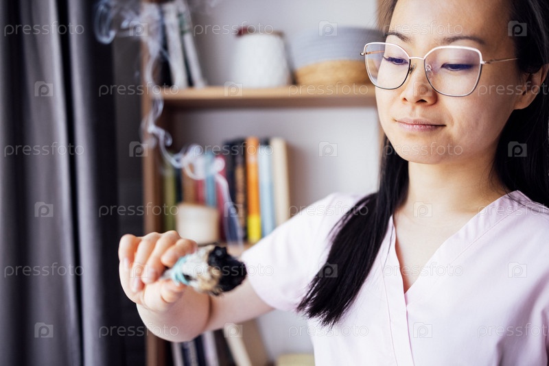 Азиатская женщина в светло-розовом наряде держит горящую волшебную палочку, окруженную книжными полками и уютной комнатой, создавая успокаивающую атмосферу с дымом