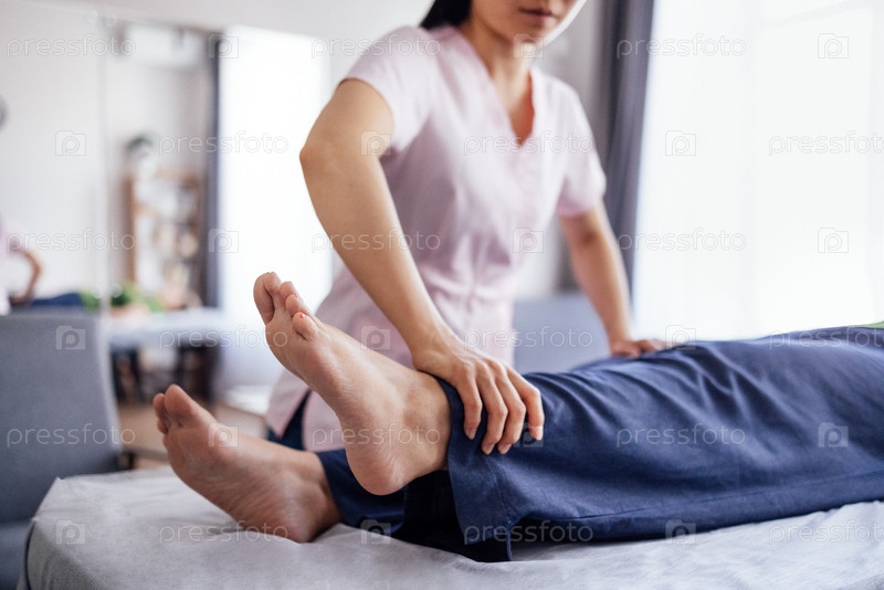Массажистка, выполняющая лечебное лечение стопы для клиента, демонстрируя методы релаксации в спокойной среде оздоровления с мягким освещением и успокаивающим декором