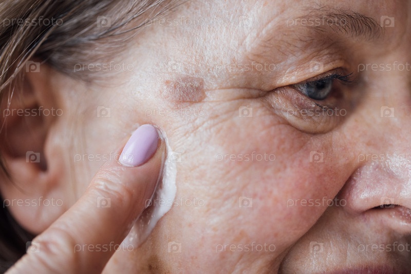 Близкий план пожилой женщины с увлажняющим кремом на щеке
