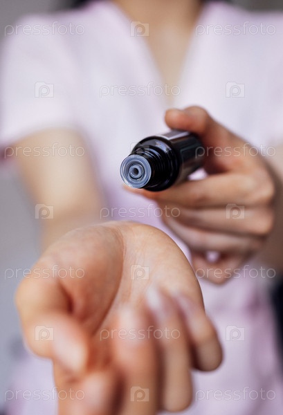 Близкий план ухоженных женских рук, наносящих ароматическое масло на запястье.Молодая женщина держит стеклянную бутылку эфирного масла