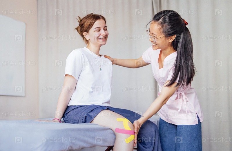 Улыбка молодой девушки с травмой колена во время осмотра врачом.Корейцы прикрепляют к пациенту кинезиологическую ленту.Подросток в непринужденной одежде сидит на диване в комнате ожидания