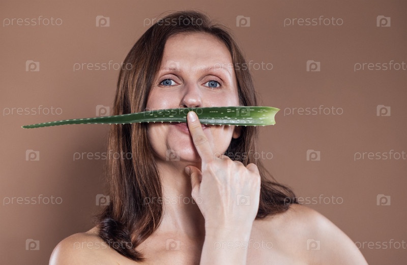 Женщина средних лет счастливо играет с листом алоэ и держит его горизонтально перед своим лицом, изображая усы.Молодая женщина демонстрирует связь с природой и заботятся о своем здоровье