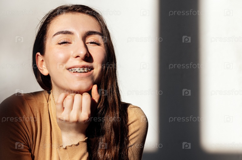 Портрет молодой девушки на ярком солнце. милый подросток в повседневной одежде улыбается и позирует внутри дома. девочка-подросток с счастливым лицом
