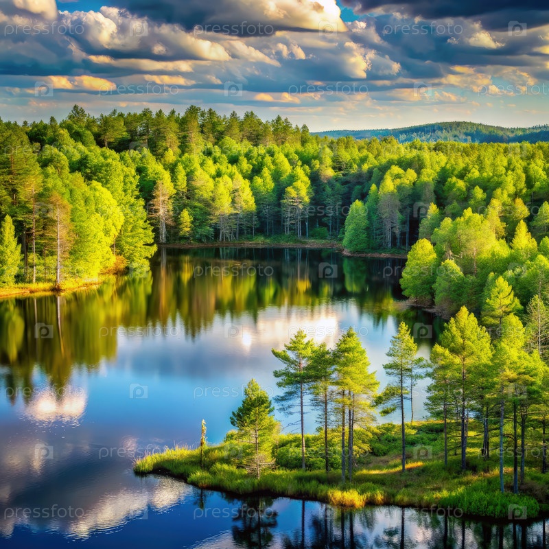 Деревья, окружающие озеро под облачным небом
