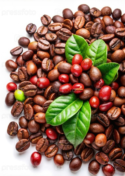 Группа кофейных зерен с листьями на вершине