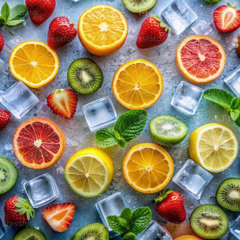 На столе есть различные фрукты и кубики льда
