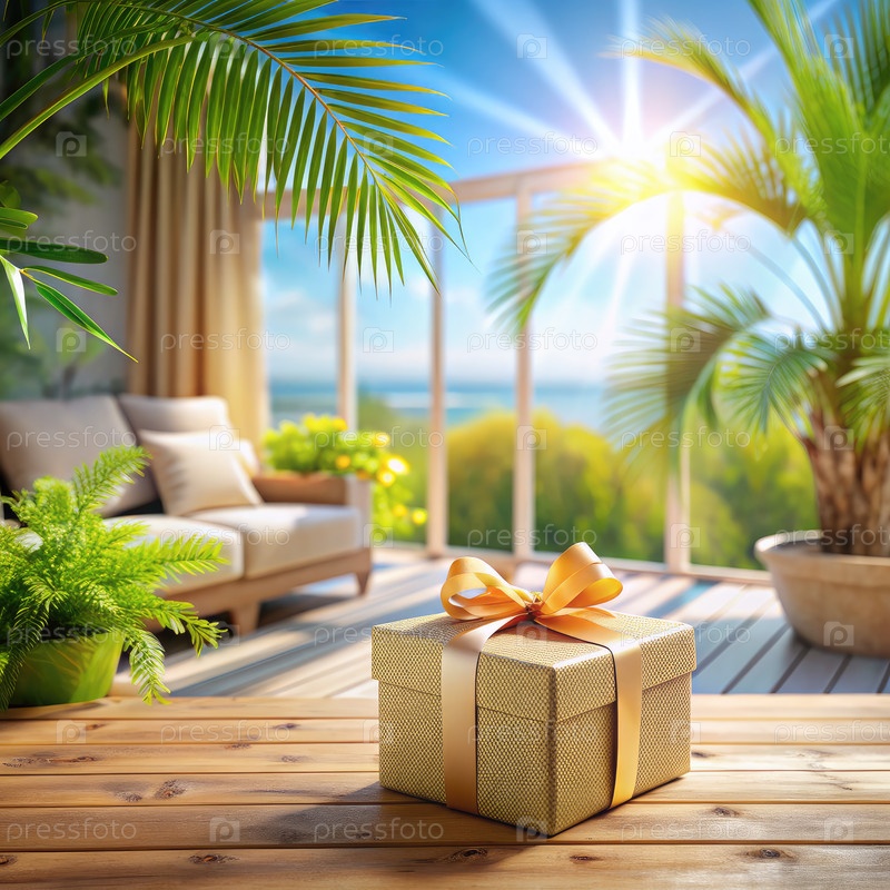 Подарочная коробка на деревянном столе, генерирующая ИИ