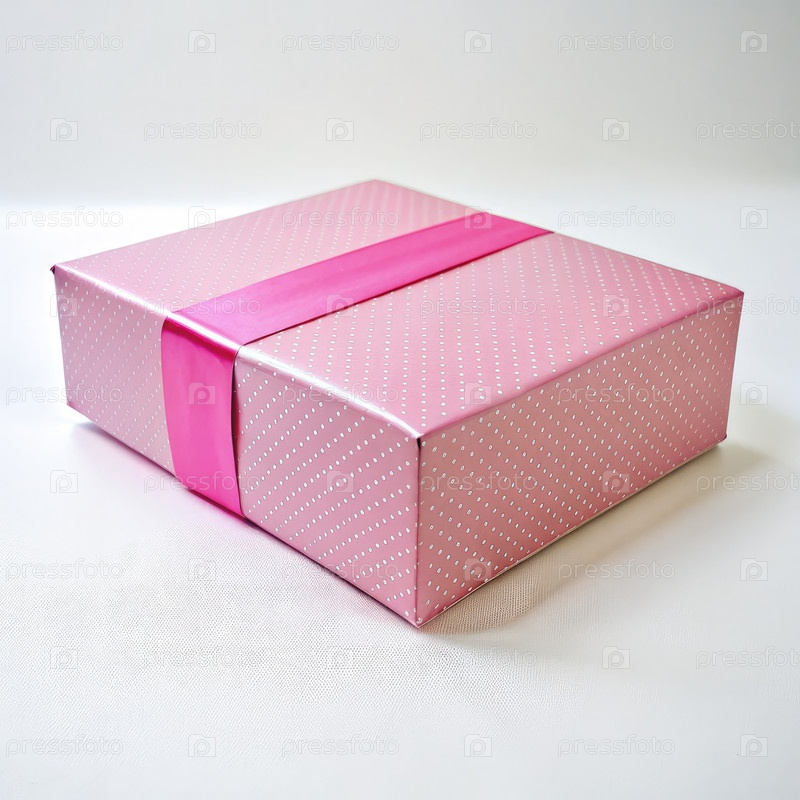 Розовая коробка с лентой на белом фоне