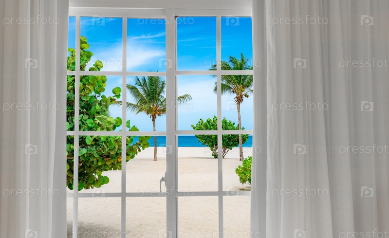 Окно с видом на пальмы и пляж