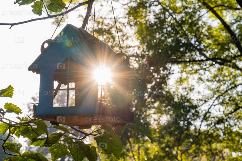 Птичий домик висит на ветке дерева