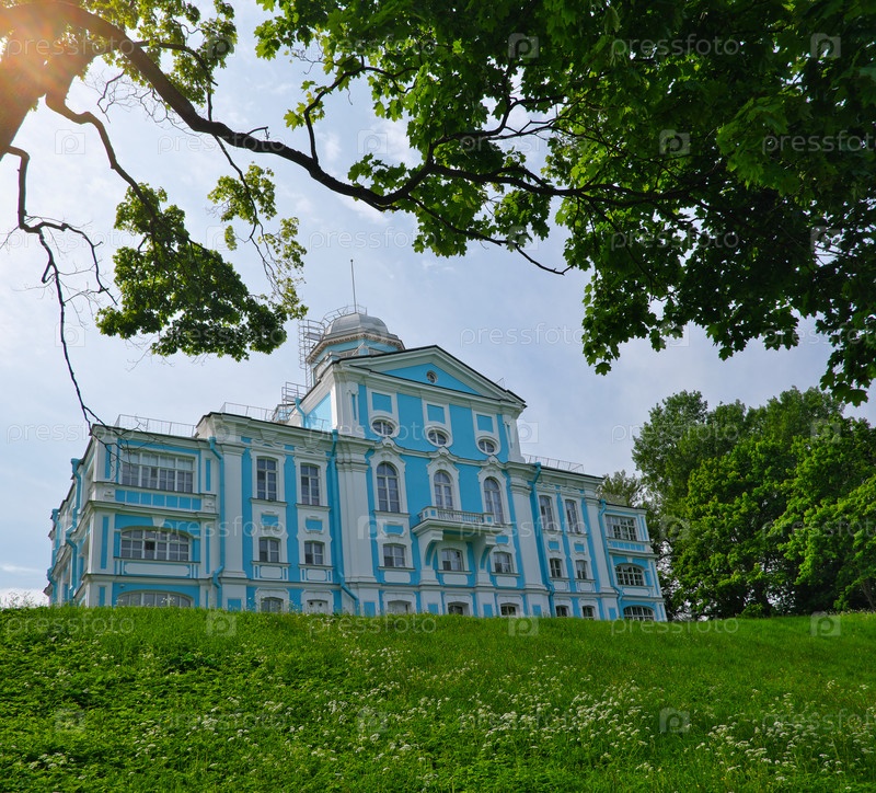 Особняк Воронцова (Особняк Новоznamenка, Санкт-Петербург), голубо-белый дворец в барокко стиле Треццини и Ринальди, летний вид с зеленой лугой