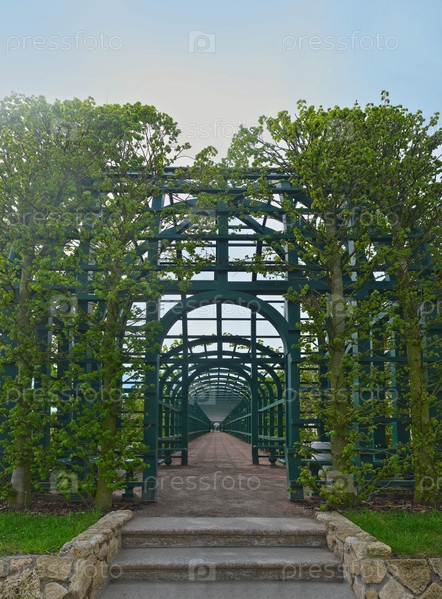 Деревянная арковая галерея Берсо покрыта зеленью летом