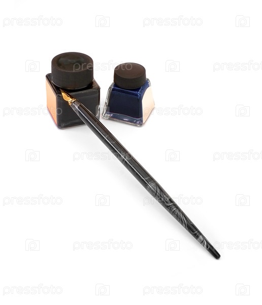 Фонтанная ручка с золотой ручкой и бутылками жидкого чернил, выделенными на белом фоне