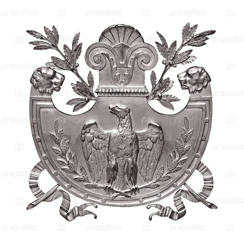 Декоративный элемент с изображением орла, щита, ленточек и веток залива изолирован на белом фоне