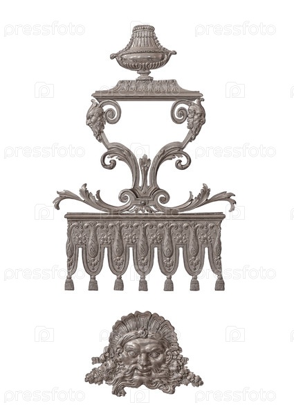 Серебряный декоративный цветочный элемент и маска в виде древнего мифологического монстра изолированы на белом фоне
