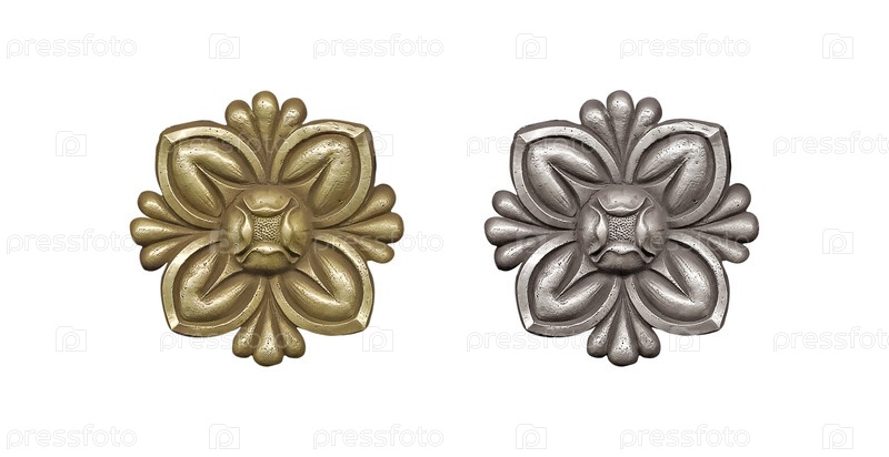 Золотой и серебряный декоративный элемент с цветочным узором, выделенным на белом фоне