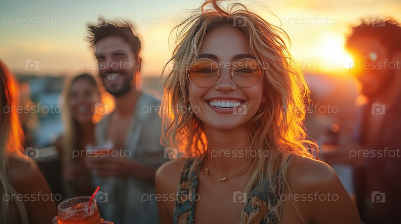 Улыбающаяся молодая женщина на вечеринке за закатом с друзьями и коктейлями