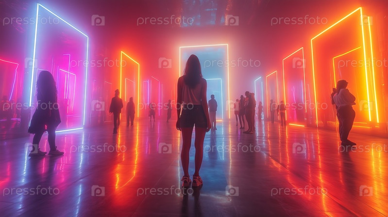 Люди исследуют красочную инсталляцию неоновых огней