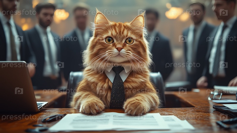 Серьезный пушистый кот в костюме и галстуке, сидящий за столом заседания