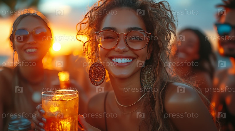 Улыбающаяся женщина держит напиток на вечеринке за закатом