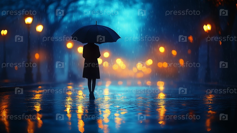 Женщина с зонтиком стоит на дождливой городской улице ночью