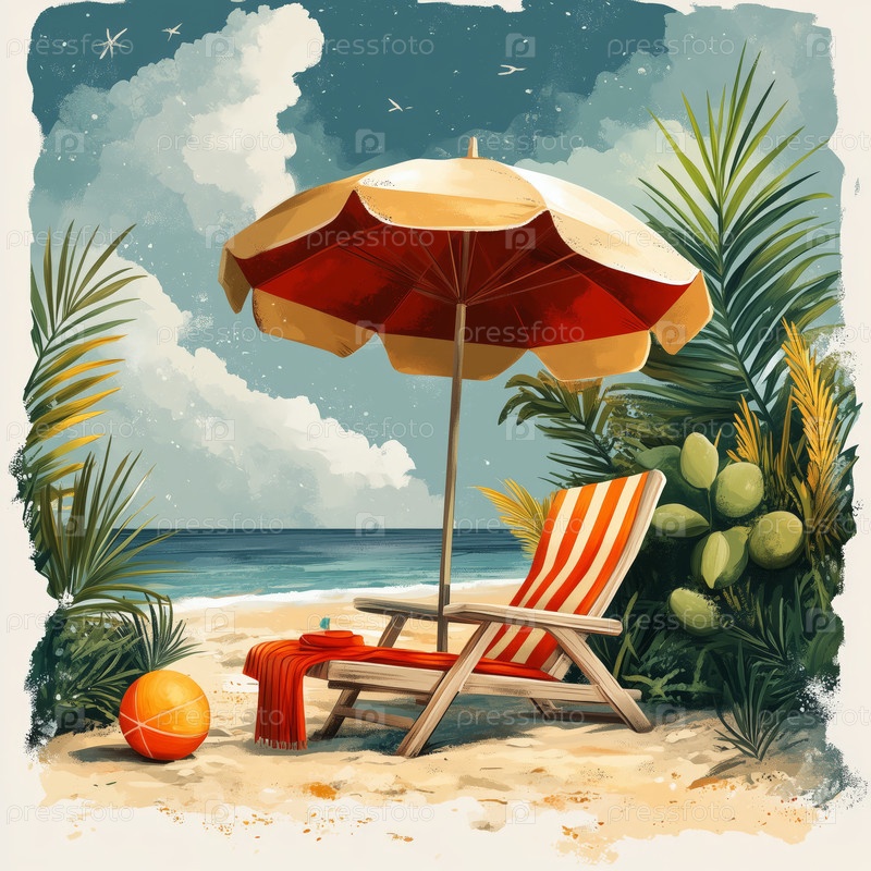 Полосатый пляжный стул и зонтик на тропическом берегу с мячом и полотенцем