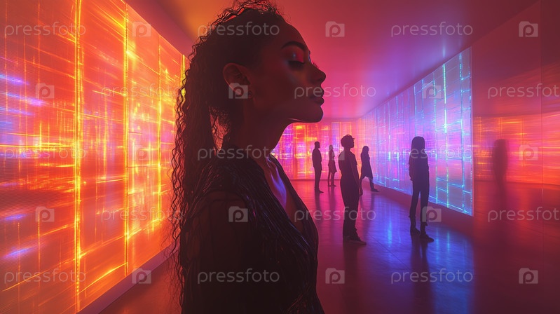 Люди, исследующие художественную инсталляцию яркого света