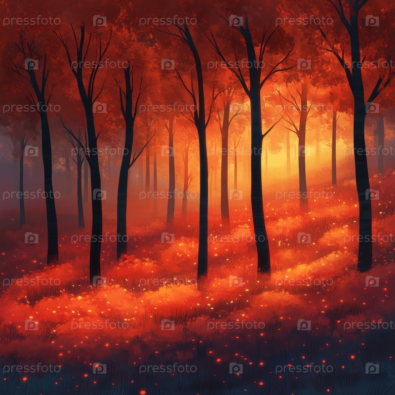 Сияющий осенний лес с огненной лиственницей и волшебным светом заката