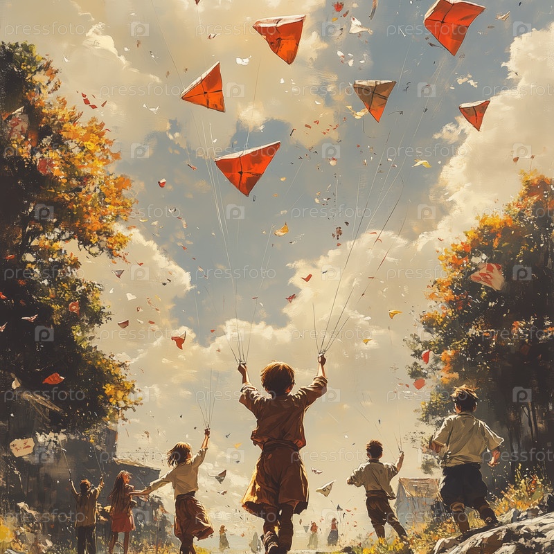 Дети летают красными воздушными змеями на осеннем поле под облачным небом