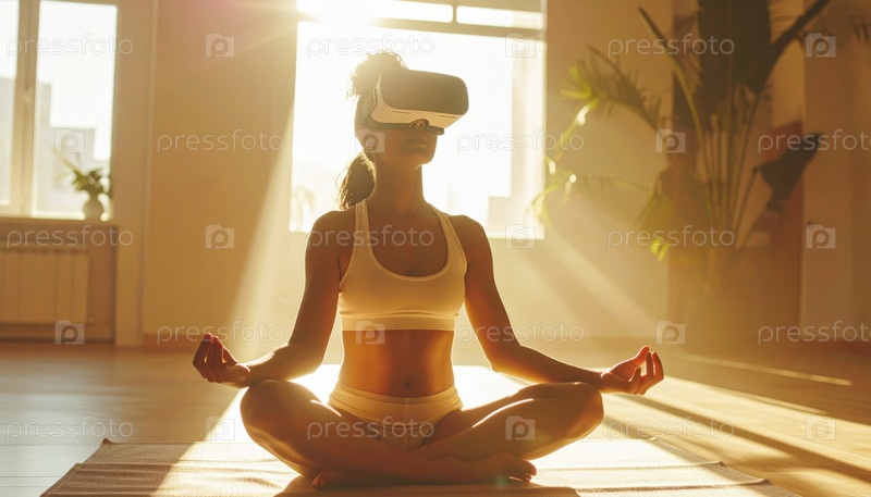 Женщина, медитирующая в положении лотоса, носит VR-гарнитуру в солнечной студии для виртуального опыта оздоровления