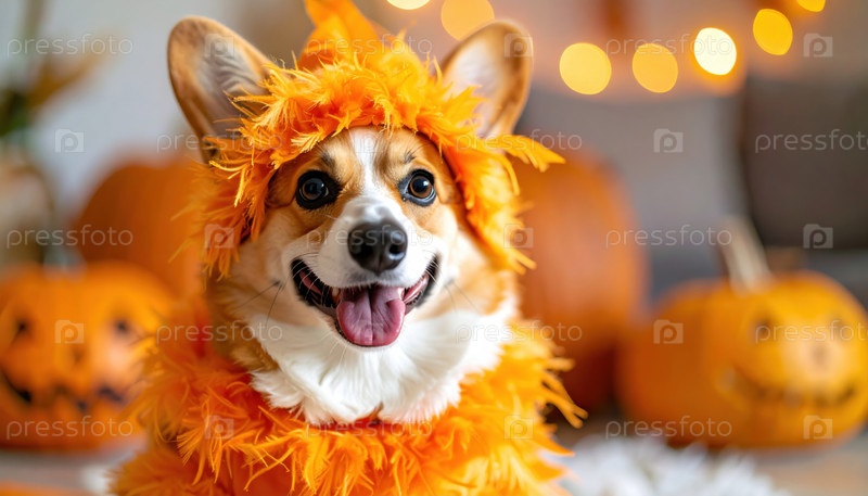 Счастливый корги, одетый в пушистый оранжевый костюм, празднует Хэллоуин с тыквами в уютной интерьерной обстановке, полной сезонных украшений