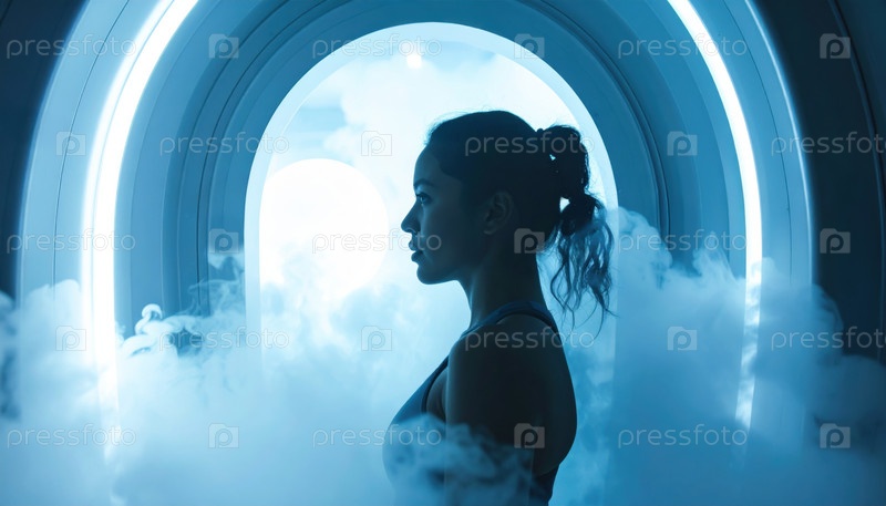 Подходящая женщина стоит внутри футуристической криотерапевтической камеры, в окружении прохладного тумана и светящихся синих огней после сеанса