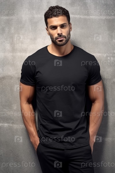 Стильный мужчина в черной футболке на бетонном фоне стены. пустое пространство для насмешек