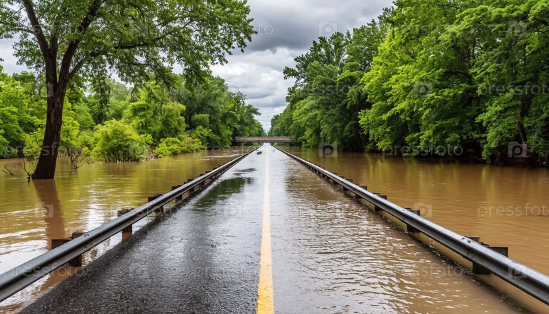 Наводнения, переполнение реки под мостом и затопленная дорога