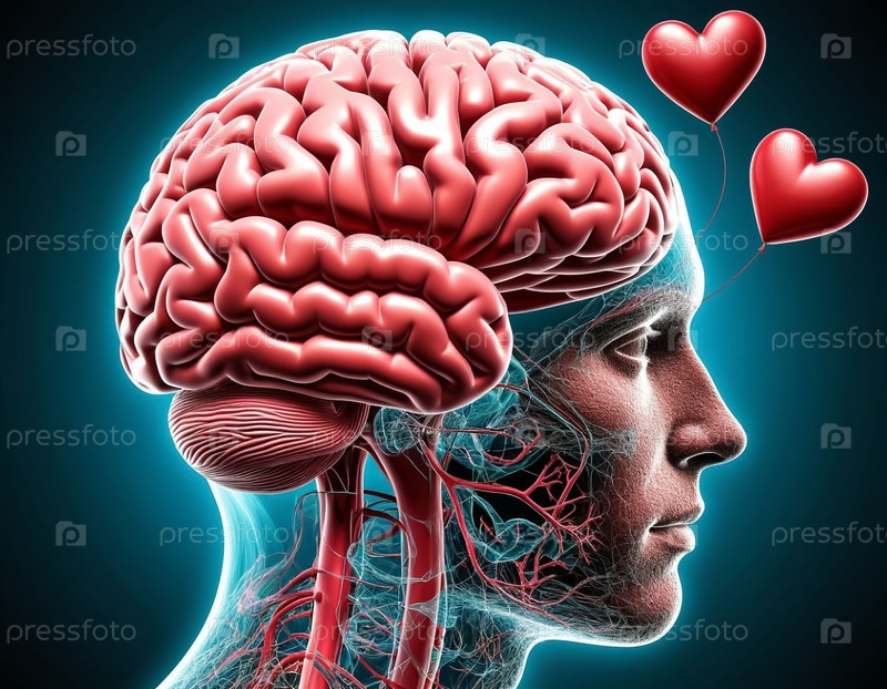 Человеческий мозг, наполненный сердцами - это концепция положительных эмоций