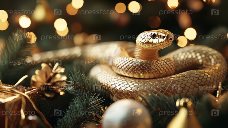 Золотая змея среди ярких огней и праздничного украшения