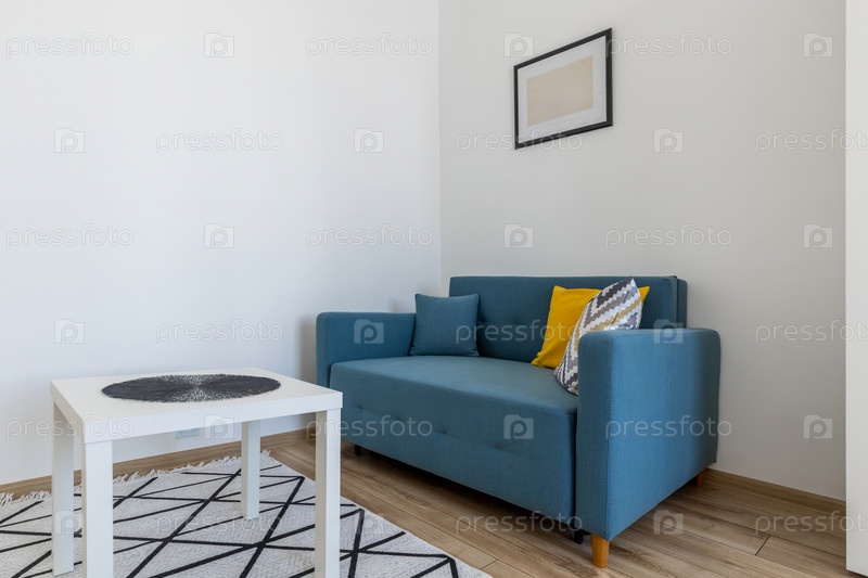 Современный яркий интерьер с синим диваном, красочными подушками, белым столом и ковром в уютной минималистической гостиной