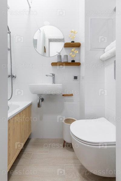 Яркая современная ванная комната с белыми плитками, стеновой туалет, компактный раковина, круглое зеркало и деревянные акцентные полки with decor