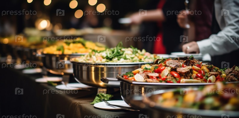 Мясо и овощи, еда на буфетном столе в отеле, группа людей, подающих блюда-буфеты внутри помещений в ресторане с сервисом мясных грилей