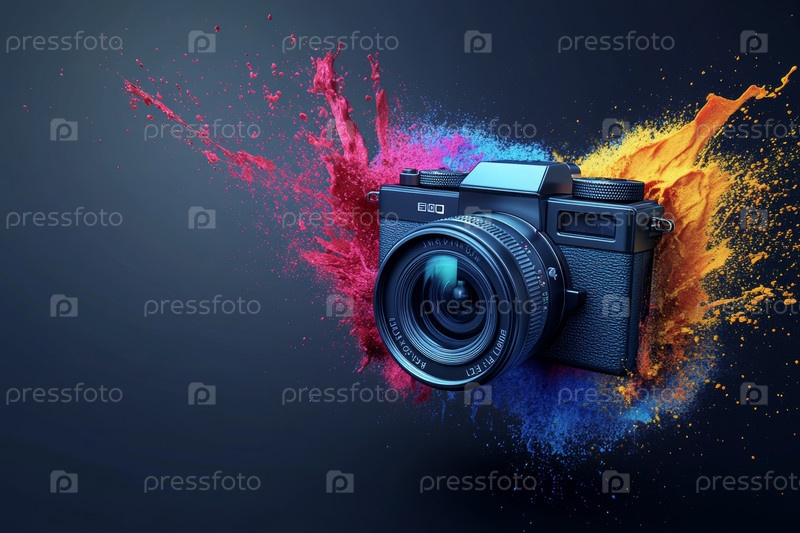 Камера возникает из яркого взрыва красочных пятен, символизирующих творческую силу фотографии