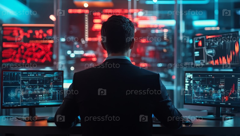 Современный диспетчерский зал с несколькими экранами данных для высокотехнологичных операций