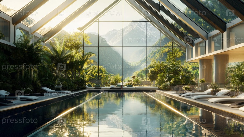 Роскошный крытый бассейн с захватывающим видом на горы
