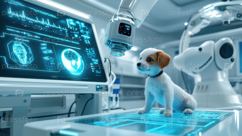 Очаровательный щенок тихо лежит под роботизированным сканером в высокотехнологичной ветеринарной клинике с футуристическими экранами, отображающими диагностику