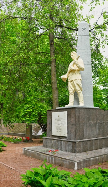 Мемориал Второй мировой войны в Красном Селе, Санкт-Петербург, памятник солдату с вечным пламенем и клумбы цветов в парке мира, летний вид